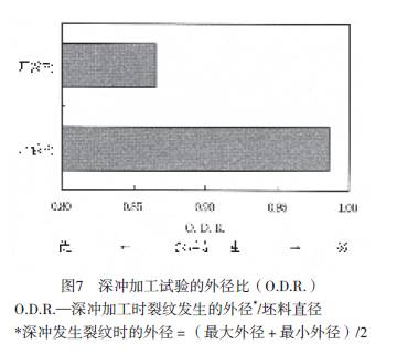 加工性是根據(jù)深沖加工試驗后的外徑比(O.D.R.)進行評價。圖7所示為試驗結(jié)果。開發(fā)材比比較材具有優(yōu)良的加工性是因為有低摩擦性的氟樹脂覆蓋了表面,降低了模具與涂膜表面間的滑動抗力,降低了成型力,提高了成型極限的緣故。