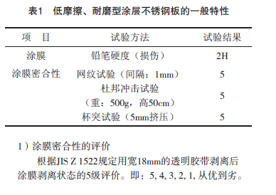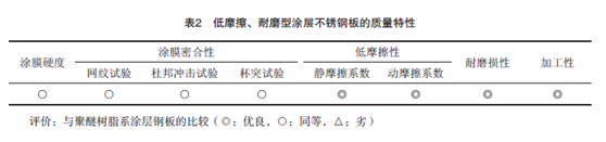 表2是低摩擦、耐磨型涂層不銹鋼板的各種質(zhì)量特性。