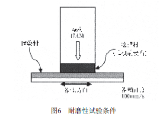 圖6所示為試驗材耐磨性試驗的方法。該法將帶有研磨粒子的非織尼龍布在試驗材的涂膜表面往復(fù)移動10000次,用目視評價涂膜的磨損狀況。另外, 為了確認特殊骨料對耐磨性的影響, 也對從開發(fā)材中除去特殊骨料的材料進行了評價。