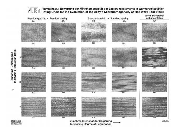 NADCA 207#-2003標(biāo)準(zhǔn)中進(jìn)行了修訂,劃分依據(jù)是偏析帶中是否存在可見(jiàn)的大顆粒一次碳化物,存在即判為不合格,并且不再區(qū)分不同鋼種的帶狀組織。如下圖: