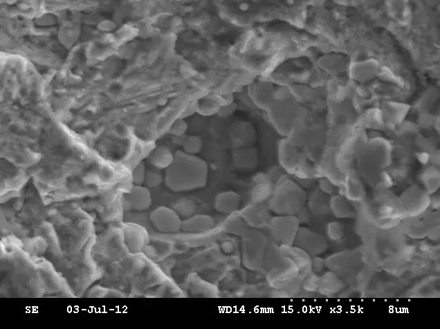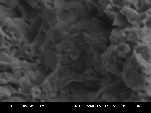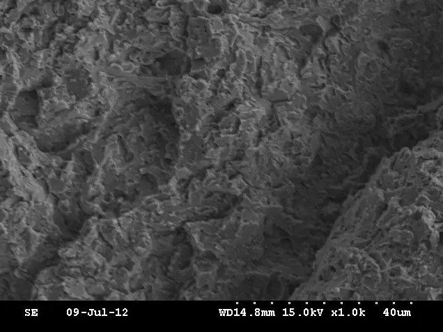 從斷口的宏觀形貌,可以看出,斷口表面光滑平整,呈黑灰色,具有明顯脆性斷裂形式。同時,在斷口邊緣還產(chǎn)生了二次脆斷,表明材料極脆。