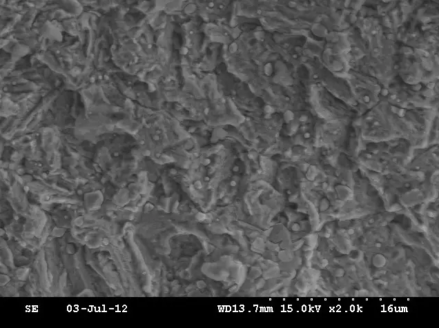 從斷口微觀形貌,可以看出,該斷口表面形貌呈河流花樣,為明顯的脆性解理斷裂。高倍下觀察發(fā)現(xiàn),斷口呈現(xiàn)小的解理平面,且解理面上布滿了碳化物。進一步放大,可看到碳化物發(fā)生了聚集,部分碳化物粗大且具有菱角狀,該類碳化物與基體組織的粘合度明顯降低,斷口上未發(fā)現(xiàn)有大量的夾雜物,初步判斷碳化物粗大且偏聚是該麻花鉆脆斷的原因之一。