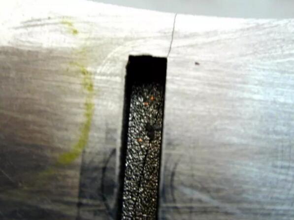 八、焊接裂紋:由于燒焊工藝或者燒焊水平或者燒焊后熱處理工藝等各方面的影響,導(dǎo)致焊區(qū)在加工使用中出現(xiàn)裂紋,裂紋形態(tài)雜亂無章,或者沿焊區(qū)邊緣分布,大面積的燒焊建議采用氬弧焊,用專用的焊枝,合理的熱處理工藝,可以減少開裂的風(fēng)險,下圖案例即燒焊不良所引起