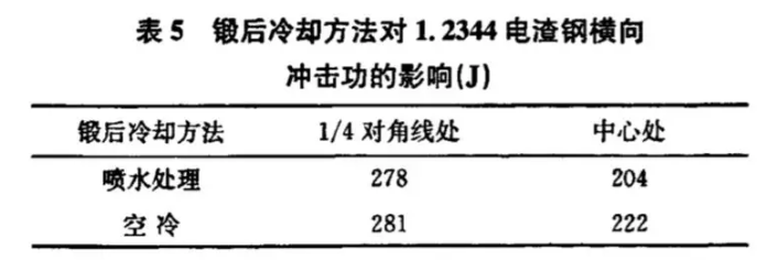 鍛后冷卻方法采用了扁鋼噴水處理和空冷兩種,表5數(shù)據(jù)顯示兩種冷卻方法對橫向沖擊性能的影響沒有明顯差別,這可能是由于1.2344鋼具有較高的淬透性造成的。