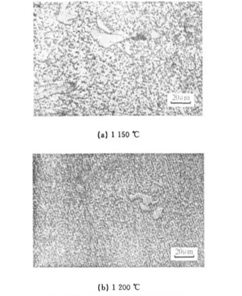圖1是1.2344鋼分別在1150°C(圖1a)和1200°C(圖1b)下保溫5h的微觀組織,通過比較可以發(fā)現(xiàn),當(dāng)擴(kuò)散溫度由1150C提高到1200°C,顯微組織中的大顆粒碳化物明顯減少,碳化物的分布更加彌散、均勻。