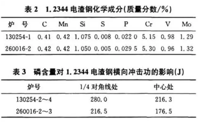 表2和表3分別表示兩批直徑為750mm的1.2344電渣鋼化學(xué)成分及其鍛成250mm×600mm扁鋼后的橫向沖擊性能。