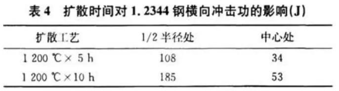 表4是對5t精煉鋼錠進(jìn)行不同擴(kuò)散時(shí)間的試驗(yàn),結(jié)果表明在相同的擴(kuò)散溫度下,擴(kuò)散時(shí)間由5h增加到10h,可以有效增加鋼材的橫向沖擊性能,其中1/2半徑處提高了41.62%,中心處提高了35.85%。