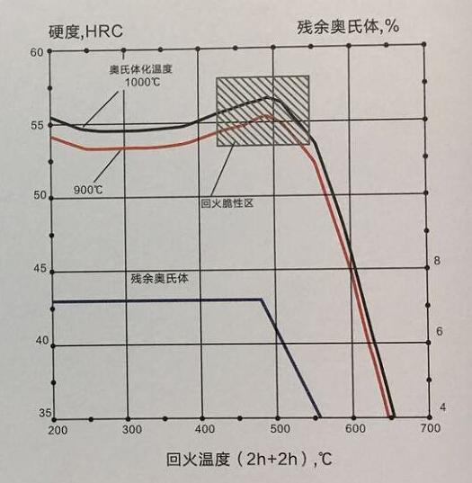 ④、回火:根據(jù)硬度要求選擇合適的回火溫度和保溫時(shí)間?;鼗饻囟菷大于550℃,至少保溫2小時(shí),每次回火后必須冷卻至室溫,至少兩次回火。不建議在425-550℃之間回火,以避免產(chǎn)生回火脆性。
