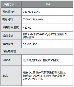 Tyrax ESR也可以在AISI420的常用硬度52HRC下使用,采用1020°C作為淬火溫度并在250°C兩次回火,每次回火保溫2小時(shí),殘余奧氏體量<2%。