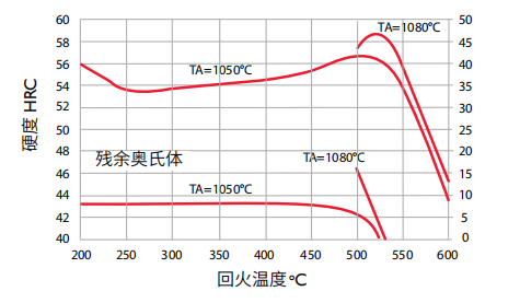 特殊情況下,可以采用1100°C的淬火溫度,回火溫度為525-530°C時(shí)硬度可提高至60HRC,僅在韌性次要時(shí)才采用1100°C淬火。