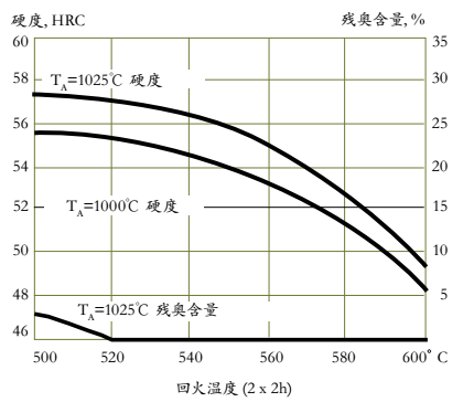 參照回火曲線圖按所需硬度值選擇回火溫度。回火至少兩次,每次回火后,必須冷卻到室溫,最低的回火溫度為525℃。保溫時間至少兩小時。
